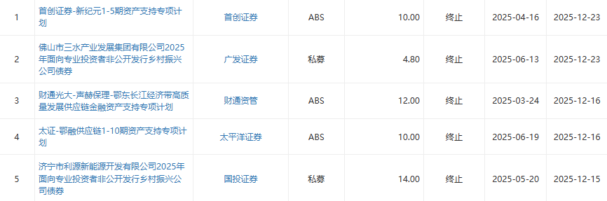 其中,“首创证券(601136)-新纪元1-5期资产支持专项计划”项目状态更新为终止。该债券拟发行规模10亿元,品种为ABS,发行人为声赫(深圳)商业保理有限公司,承销商/管理人为首创证券,受理日期为2025年4月16日。